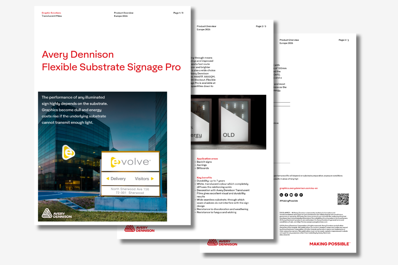 Mehr durchdringendes Licht bedeutet sowohl Energieeinsparung als auch verbesserte visuelle Wirkung – und einen schnellen Weg zu präziseren und farbintesiveren Grafiken. Dazu gibt es eine große Auswahl an kompatiblen Folien der Reihe Avery Dennison Translucent: 4500TF, 5500QM, 5600LD und 5300 Blockout. Flexible Substrate Signage Pro ist in Mindestbestellmengen schon ab einer Rolle erhältlich.