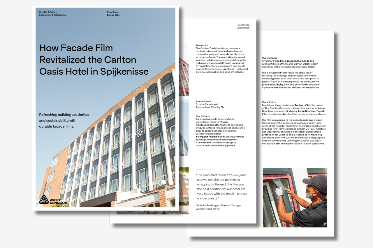Avery Dennison® ️Facade Film bietet eine innovative, langlebige Lösung für die Modernisierung von Gebäuden, ohne dass störende Renovierungsarbeiten erforderlich sind. In Spijkenisse in den Niederlanden wurde das ikonische Carlton Hotel mit unserer Fassadenfolie revitalisiert. Die verblasste Fassade und die Fensterrahmen wurden nach 33 Jahren erneuert, wobei sowohl die Ästhetik als auch die Haltbarkeit verbessert wurden.