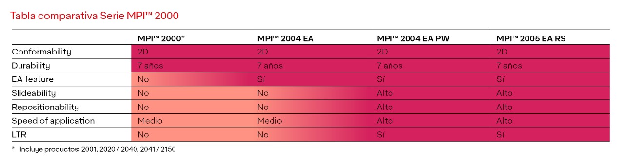 Seleccione la opción que mejor se adapte a sus necesidades, incluidos los productos con tecnología Avery Dennison Easy Apply™ y Easy Apply™ RS, disponibles en MPI 2004 EA, MPI 2004 EA PW y MPI 2005 EA RS, para una instalación más rápida, fácil y sin burbujas de aire.