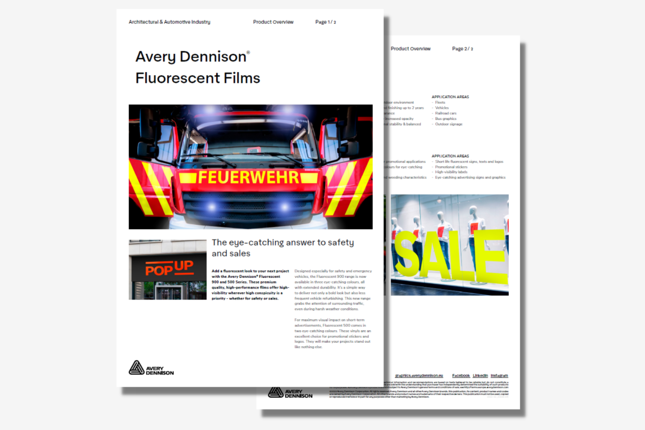 Dona un aspetto fluorescente al tuo prossimo progetto con le serie Avery Dennison® Fluorescent 900 e 500. Questi film di qualità premium dalle elevate prestazioni offrono un’elevata visibilità nei casi in cui è necessaria, sia per motivi di sicurezza o di vendita.