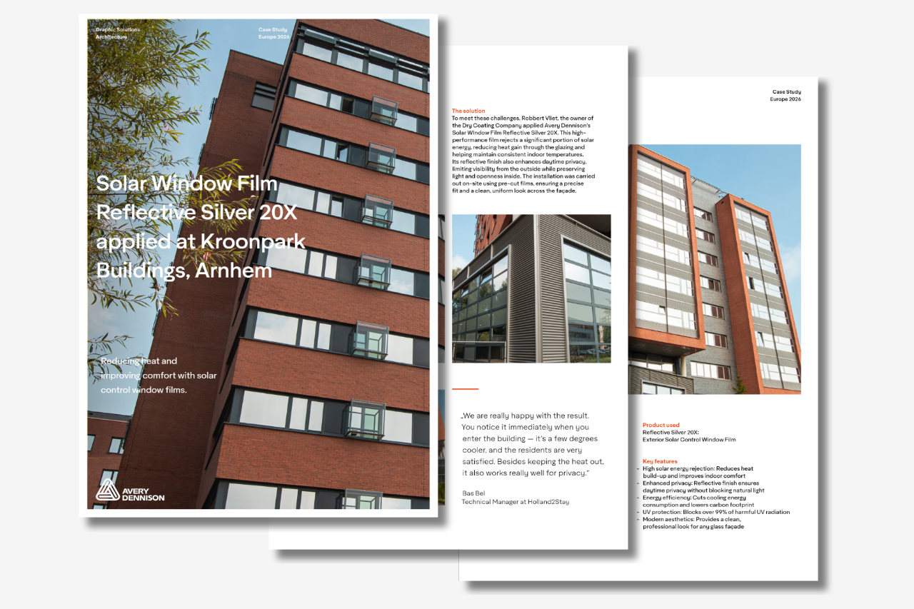 La gamma di pellicole solari riflettenti per finestre di Avery Dennison®️ offre un modo semplice per aumentare la sostenibilità di un edificio, aggiungendo allo stesso tempo un forte impatto visivo. Quest'anno la nostra Architectural Window Film - R Silver 20 X è stata utilizzata per la proprietà Holland2Stay di Arnhem, per aumentare il comfort delle persone all'interno dell'edificio.